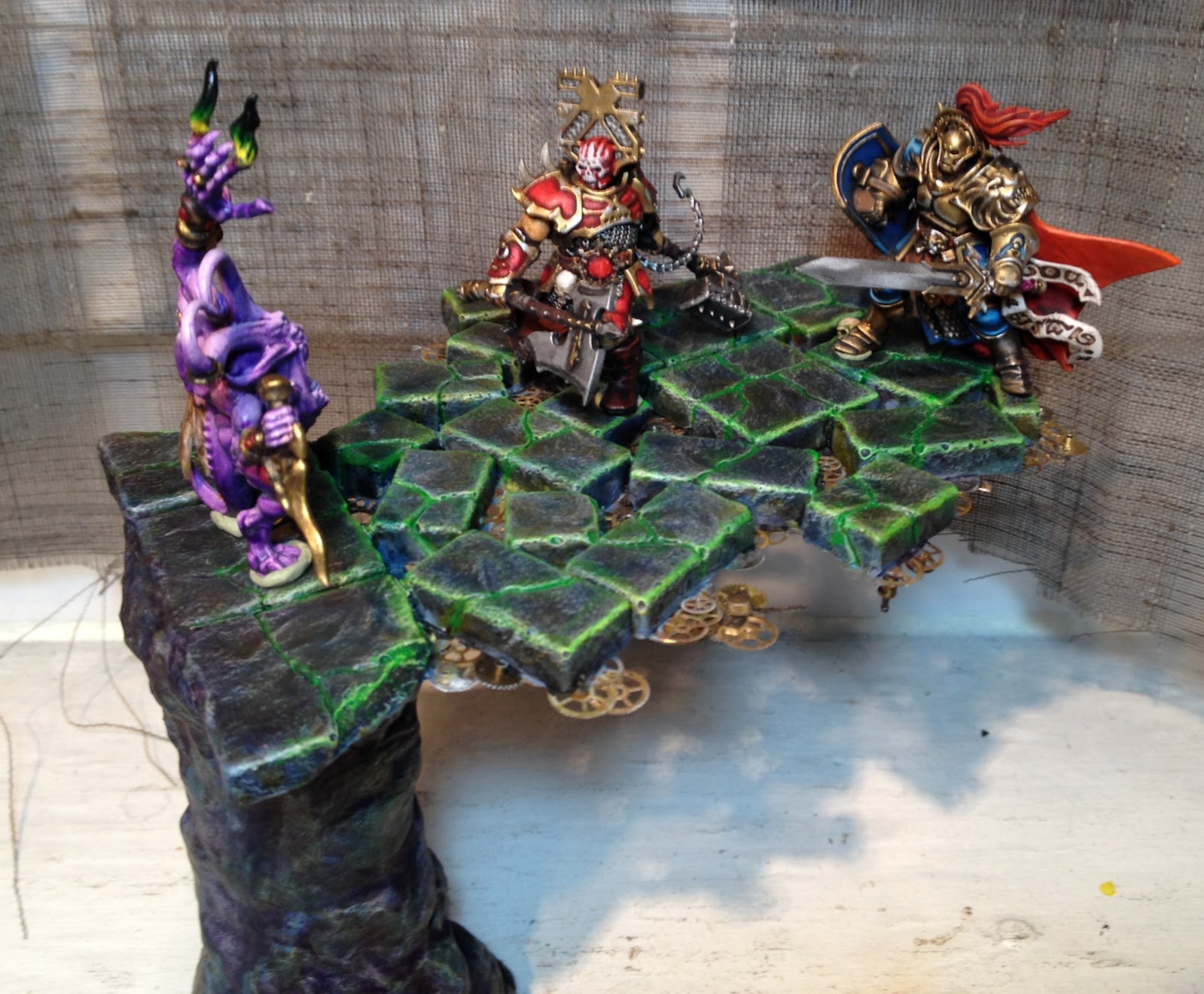 Pour me faire une idée, j'ai placé les 3 figurines pour me faire une idée de l'espace occupé et de la mise en scène. Normalement, elles sont inversées, l'Horreur Rose est à droite et le Knight à gauche, le guerrier de Khorne pivote de 180°